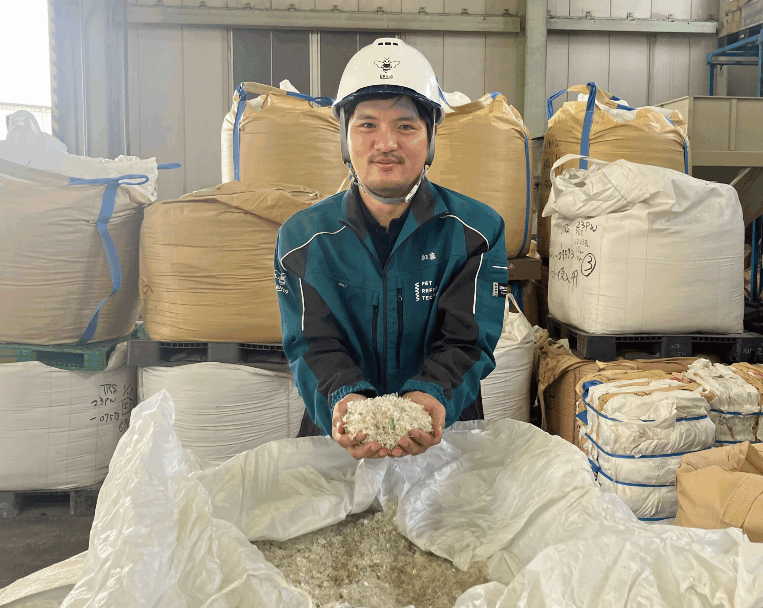 工場で使用するPETボトル由来の原料の調達を担当しています。使用済みのPETボトルは排出時に、圧縮された「ベール状」や細かく砕かれた「フレーク状」など様々な形で流通しており、品質も均一ではありません。不純物がほとんど含まれないものもあれば、ラベル・キャップ・アルミ缶・スチール缶などが混ざっている場合もあります。原料調達では、工場基準を満たすものを直接仕入れるだけでなく、基準に達しない原料については協力会社に加工を依頼し、工場で安定的に使用できる品質に仕上げています。特に、他のリサイクル会社では原料として扱いづらい、リサイクル工程で発生する副産物も有効活用できる点が当社の強みです。