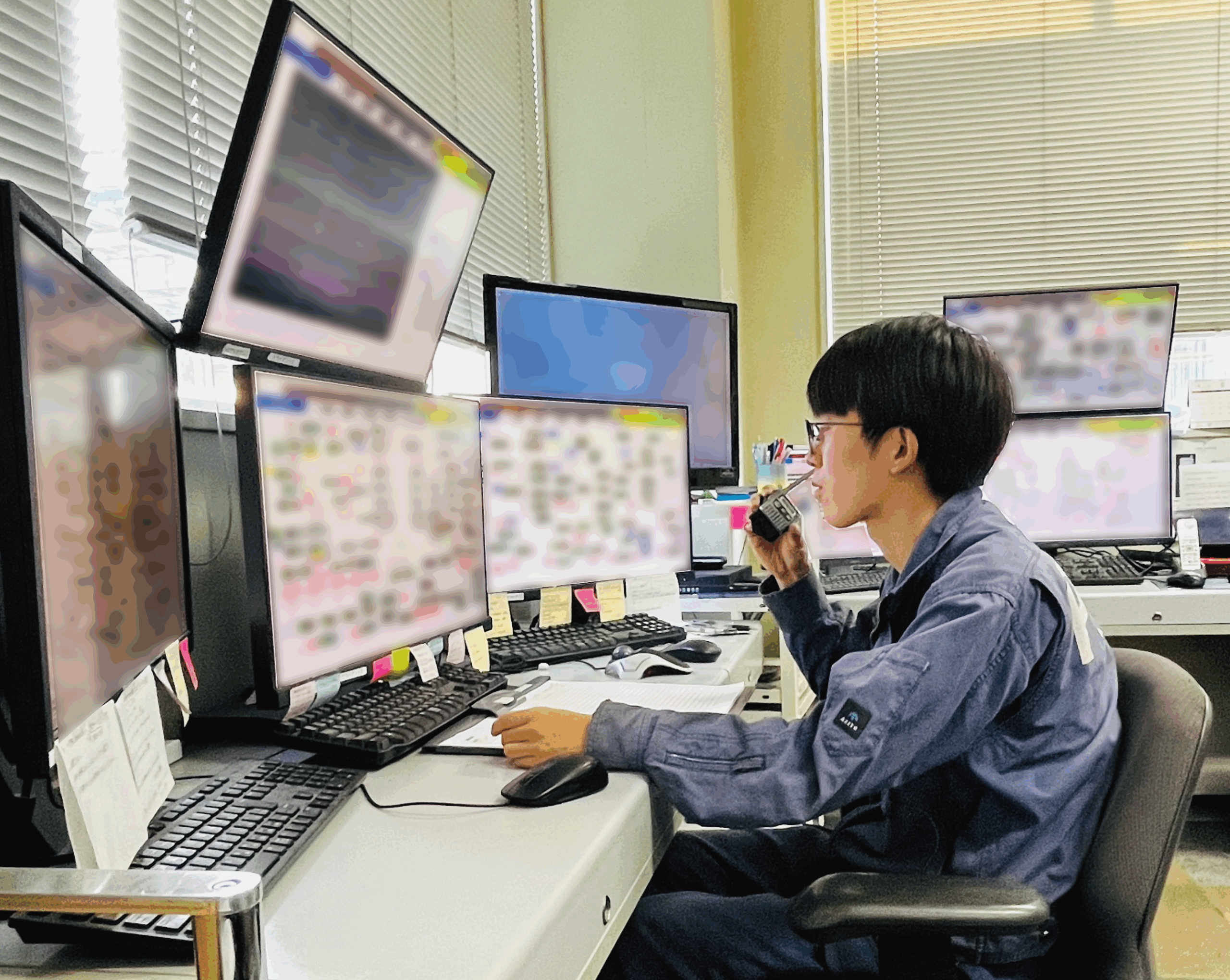 中央操作室でプラントの運転状況を監視・運用する業務を担当しています。主な仕事は、各工程の機器の温度、圧力、流量といったデータをリアルタイムで監視し、プラント全体を安全かつ安定的に稼働させることです。